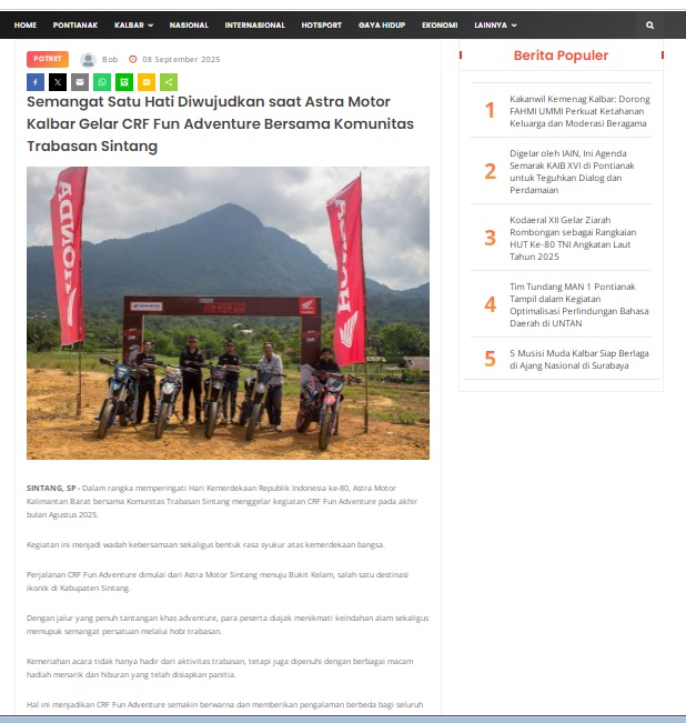 Semangat Satu Hati Diwujudkan saat Astra Motor Kalbar Gelar CRF Fun Adventure Bersama Komunitas Trabasan Sintang by masmul 8 September 2025 in Silahkan kunjungi https://www.suarapemredkalbar.com/read/potret/08092025/semangat-satu-hati-diwujudkan-saat-astra-motor-kalbar-gelar-crf-fun-adventure-bersama-komunitas-trabasan-sintang. You Might Like Regional Public Launching New ADV160 The SUV Pride Grand Launching New PCX 160 Truly Exceptional! Tetap hati-hati ya bro sist berkendara saat hujan.