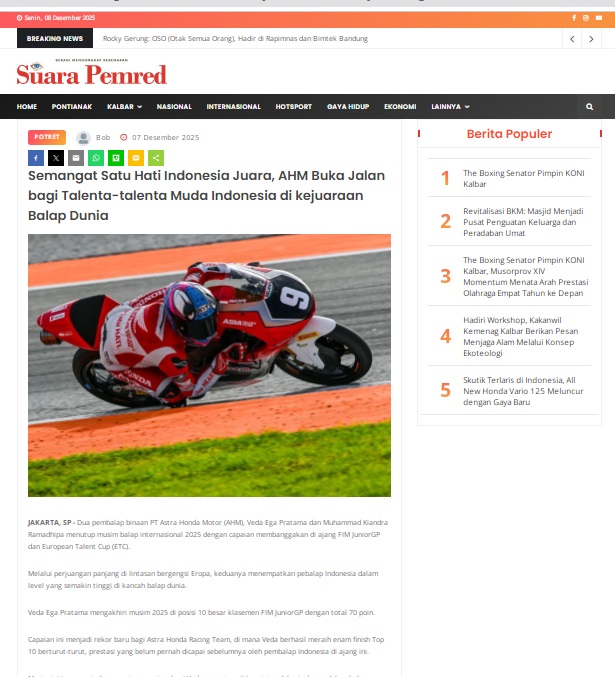 Semangat Satu Hati Indonesia Juara, AHM Buka Jalan bagi Talenta-talenta Muda Indonesia di kejuaraan Balap Dunia by masmul 7 Desember 2025 in Silahkan kunjungi https://www.suarapemredkalbar.com/read/potret/07122025/semangat-satu-hati-indonesia-juara-ahm-buka-jalan-bagi-talenta-talenta-muda-indonesia-di-kejuaraan-balap-dunia. You Might Like Regional Public Launching New ADV160 The SUV Pride Grand Launching New PCX 160 Truly Exceptional! Tetap hati-hati ya bro sist berkendara saat hujan.