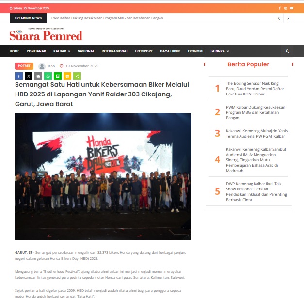 Semangat Satu Hati untuk Kebersamaan Biker Melalui HBD 2025 di Lapangan Yonif Raider 303 Cikajang, Garut, Jawa Barat by masmul 19 November 2025 in Silahkan kunjungi https://www.suarapemredkalbar.com/read/potret/19112025/semangat-satu-hati-untuk-kebersamaan-biker-melalui-hbd-2025-di-lapangan-yonif-raider-303-cikajang-garut-jawa-barat. You Might Like Regional Public Launching New ADV160 The SUV Pride Grand Launching New PCX 160 Truly Exceptional! Tetap hati-hati ya bro sist berkendara saat hujan.