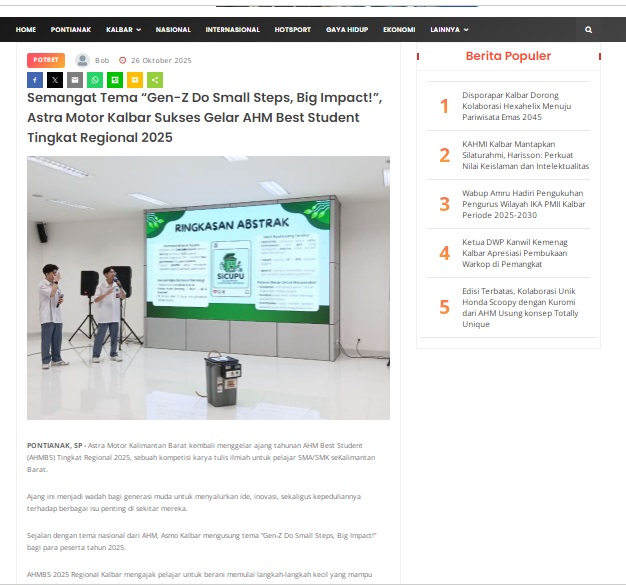 Semangat Tema “Gen-Z Do Small Steps, Big Impact!”, Astra Motor Kalbar Sukses Gelar AHM Best Student Tingkat Regional 2025 by masmul 26 Oktober 2025 in Silahkan kunjungi https://www.suarapemredkalbar.com/read/potret/26102025/semangat-tema-gen-z-do-small-steps-big-impact-astra-motor-kalbar-sukses-gelar-ahm-best-student-tingkat-regional-2025. You Might Like Regional Public Launching New ADV160 The SUV Pride Grand Launching New PCX 160 Truly Exceptional! Tetap hati-hati ya bro sist berkendara saat hujan.
