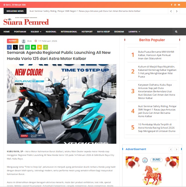 Semarak Agenda Regional Public Launching All New Honda Vario 125 dari Astra Motor Kalbar by masmul 17 Februari 2026 in Silahkan kunjungi https://www.suarapemredkalbar.com/read/potret/17022026/semarak-agenda-regional-public-launching-all-new-honda-vario-125-dari-astra-motor-kalbar. You Might Like Regional Public Launching New ADV160 The SUV Pride Grand Launching New PCX 160 Truly Exceptional! Tetap hati-hati ya bro sist berkendara saat hujan.