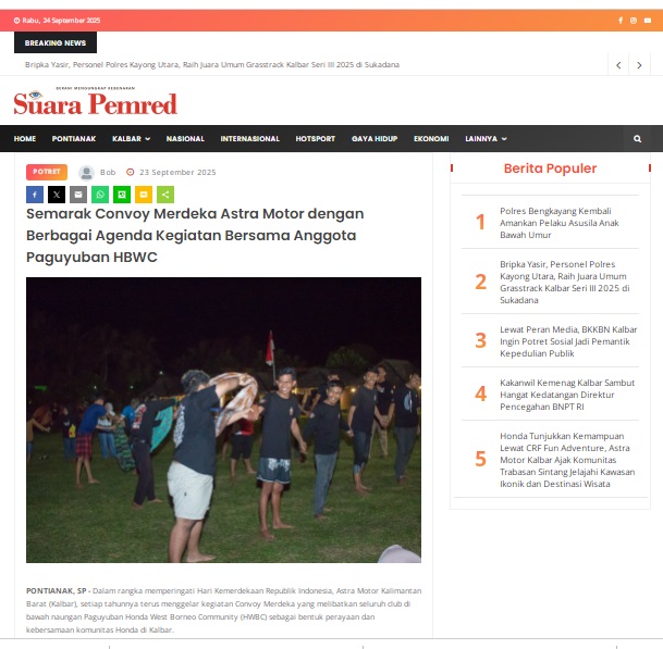 Semarak Convoy Merdeka Astra Motor dengan Berbagai Agenda Kegiatan Bersama Anggota Paguyuban HBWC by masmul 23 September 2025 in Silahkan kunjungi https://www.suarapemredkalbar.com/read/potret/23092025/semarak-convoy-merdeka-astra-motor-dengan-berbagai-agenda-kegiatan-bersama-anggota-paguyuban-hbwc. You Might Like Regional Public Launching New ADV160 The SUV Pride Grand Launching New PCX 160 Truly Exceptional! Tetap hati-hati ya bro sist berkendara saat hujan.