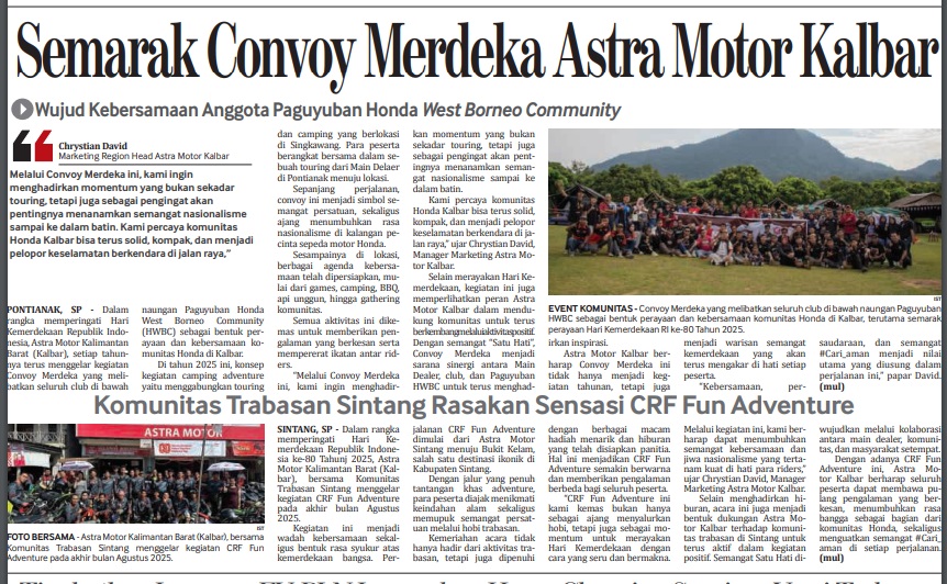 Semarak Convoy Merdeka Astra Motor Kalbar, Wujud Kebersamaan Anggota Paguyuban Honda West Borneo Community by masmul 4 September 2025 in Silahkan buka . You Might Like Regional Public Launching New ADV160 The SUV Pride Grand Launching New PCX 160 Truly Exceptional! Tetap hati-hati ya bro sist berkendara saat hujan.