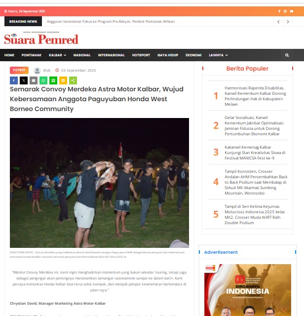 Semarak Convoy Merdeka Astra Motor Kalbar, Wujud Kebersamaan Anggota Paguyuban Honda West Borneo Community by masmul 3 September 2025 in Silahkan kunjungi https://www.suarapemredkalbar.com/read/potret/03092025/semarak-convoy-merdeka-astra-motor-kalbar-wujud-kebersamaan-anggota-paguyuban-honda-west-borneo-community. You Might Like Regional Public Launching New ADV160 The SUV Pride Grand Launching New PCX 160 Truly Exceptional! Tetap hati-hati ya bro sist berkendara saat hujan.