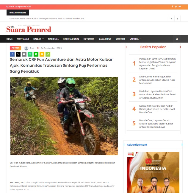 Semarak CRF Fun Adventure dari Astra Motor Kalbar Ajak, Komunitas Trabasan Sintang Puji Performas Sang Penakluk by masmul 4 September 2025 in Silahkan kunjungi https://www.suarapemredkalbar.com/read/potret/04092025/semarak-crf-fun-adventure-dari-astra-motor-kalbar-ajak-komunitas-trabasan-sintang-puji-performas-sang-penakluk. You Might Like Regional Public Launching New ADV160 The SUV Pride Grand Launching New PCX 160 Truly Exceptional! Tetap hati-hati ya bro sist berkendara saat hujan.