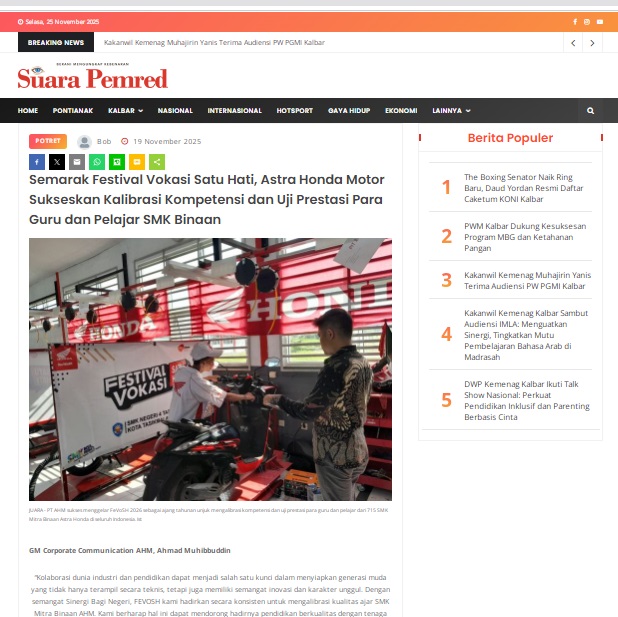 Semarak Festival Vokasi Satu Hati, Astra Honda Motor Sukseskan Kalibrasi Kompetensi dan Uji Prestasi Para Guru dan Pelajar SMK Binaan by masmul 19 November 2025 in Silahkan kunjungi https://www.suarapemredkalbar.com/read/potret/19112025/semarak-festival-vokasi-satu-hati-astra-honda-motor-sukseskan-kalibrasi-kompetensi-dan-uji-prestasi-para-guru-dan-pelajar-smk-binaan. You Might Like Regional Public Launching New ADV160 The SUV Pride Grand Launching New PCX 160 Truly Exceptional! Tetap hati-hati ya bro sist berkendara saat hujan.