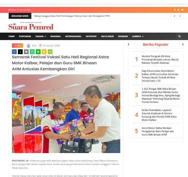 Semarak Festival Vokasi Satu Hati Regional Astra Motor Kalbar, Pelajar dan Guru SMK Binaan AHM Antusias Kembangkan Diri by masmul 22 Januari 2026 in Silahkan kunjungi https://www.suarapemredkalbar.com/read/potret/22012026/semarak-festival-vokasi-satu-hati-regional-astra-motor-kalbar-pelajar-dan-guru-smk-binaan-ahmantusias-kembangkan-diri. You Might Like Regional Public Launching New ADV160 The SUV Pride Grand Launching New PCX 160 Truly Exceptional! Tetap hati-hati ya bro sist berkendara saat hujan.