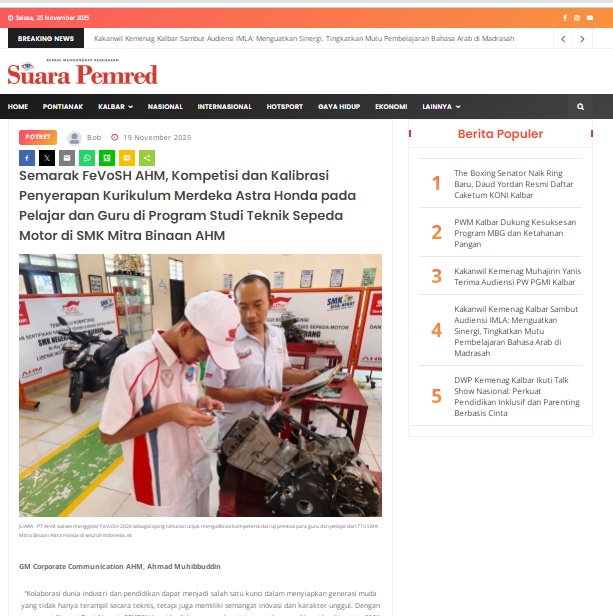 Semarak FeVoSH AHM, Kompetisi dan Kalibrasi Penyerapan Kurikulum Merdeka Astra Honda pada Pelajar dan Guru di Program Studi Teknik Sepeda Motor di SMK Mitra Binaan AHM by masmul 19 November 2025 in Silahkan kunjungi https://www.suarapemredkalbar.com/read/potret/19112025/semarak-fevosh-ahm-kompetisi-dan-kalibrasi-penyerapan-kurikulum-merdeka-astra-honda-pada-pelajar-dan-guru-di-program-studi-teknik-sepeda-motor-di-smk-mitra-binaan-ahm. You Might Like Regional Public Launching New ADV160 The SUV Pride Grand Launching New PCX 160 Truly Exceptional! Tetap hati-hati ya bro sist berkendara saat hujan.