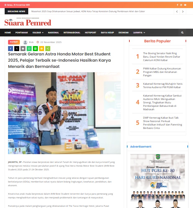 Semarak Gelaran Astra Honda Motor Best Student 2025, Pelajar Terbaik se-Indonesia Hasilkan Karya Menarik dan Bermanfaat by masmul 22 November 2025 in Silahkan kunjungi https://www.suarapemredkalbar.com/read/potret/22112025/semarak-gelaran-astra-honda-motor-best-student-2025-pelajar-terbaik-se-indonesia-hasilkan-karya-menarik-dan-bermanfaat. You Might Like Regional Public Launching New ADV160 The SUV Pride Grand Launching New PCX 160 Truly Exceptional! Tetap hati-hati ya bro sist berkendara saat hujan.