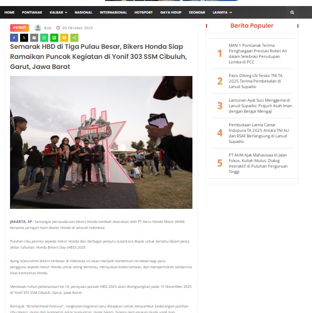 Semarak HBD di Tiga Pulau Besar, Bikers Honda Siap Ramaikan Puncak Kegiatan di Yonif 303 SSM Cibuluh, Garut, Jawa Barat by masmul 5 Oktober 2025 in Silahkan kunjungi https://www.suarapemredkalbar.com/read/potret/05102025/semarak-hbd-di-tiga-pulau-besar-bikers-honda-siap-ramaikan-puncak-kegiatan-di-yonif-303-ssm-cibuluh-garut-jawa-barat. You Might Like Regional Public Launching New ADV160 The SUV Pride Grand Launching New PCX 160 Truly Exceptional! Tetap hati-hati ya bro sist berkendara saat hujan.