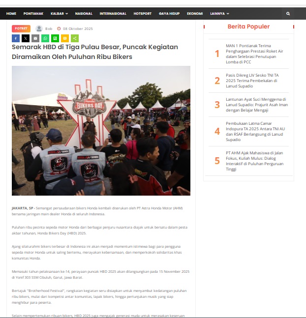 Semarak HBD di Tiga Pulau Besar, Puncak Kegiatan Diramaikan Oleh Puluhan Ribu Bikers by masmul 8 Oktober 2025 in Silahkan kunjungi https://www.suarapemredkalbar.com/read/potret/08102025/semarak-hbd-di-tiga-pulau-besar-puncak-kegiatan-diramaikan-oleh-puluhan-ribu-bikers. You Might Like Regional Public Launching New ADV160 The SUV Pride Grand Launching New PCX 160 Truly Exceptional! Tetap hati-hati ya bro sist berkendara saat hujan.