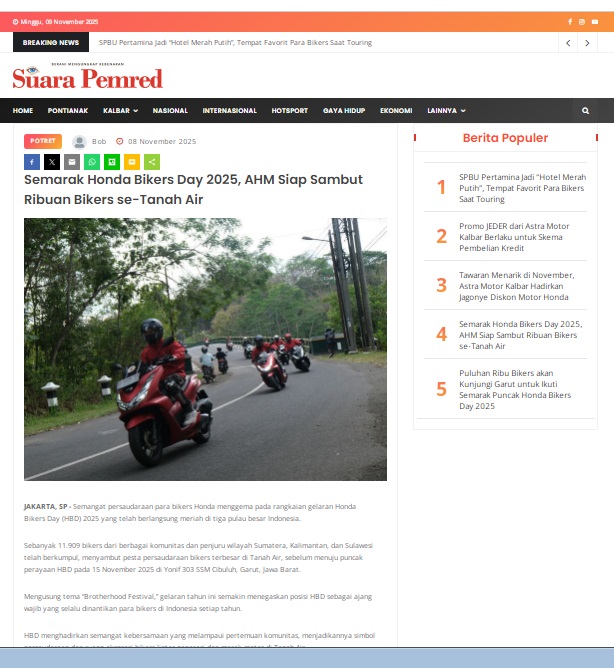 Semarak Honda Bikers Day 2025, AHM Siap Sambut Ribuan Bikers se-Tanah Air by masmul 8 November 2025 in Silahkan kunjungi https://www.suarapemredkalbar.com/read/potret/08112025/semarak-honda-bikersday-2025-ahm-siap-sambut-ribuan-bikers-se-tanah-air. You Might Like Regional Public Launching New ADV160 The SUV Pride Grand Launching New PCX 160 Truly Exceptional! Tetap hati-hati ya bro sist berkendara saat hujan.