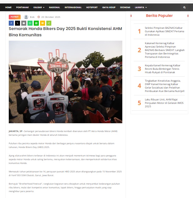 Semarak Honda Bikers Day 2025 Bukti Konsistensi AHM Bina Komunitas by masmul 20 Oktober 2025 in Silahkan kunjungi https://www.suarapemredkalbar.com/read/potret/20102025/semarak-honda-bikers-day-2025-bukti-konsistensi-ahm-bina-komunitas. You Might Like Regional Public Launching New ADV160 The SUV Pride Grand Launching New PCX 160 Truly Exceptional! Tetap hati-hati ya bro sist berkendara saat hujan.