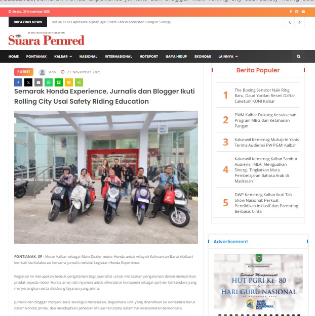 Semarak Honda Experience, Jurnalis dan Blogger Ikuti Rolling City Usai Safety Riding Education by masmul 21 November 2025 in Silahkan kunjungi https://www.suarapemredkalbar.com/read/potret/21112025/semarak-honda-experience-jurnalis-dan-blogger-ikuti-rolling-city-usai-safety-riding-education. You Might Like Regional Public Launching New ADV160 The SUV Pride Grand Launching New PCX 160 Truly Exceptional! Tetap hati-hati ya bro sist berkendara saat hujan.