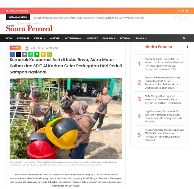 Semarak Kolaborasi Asri di Kubu Raya, Astra Motor Kalbar dan SDIT Al Karima Gelar Peringatan Hari Peduli Sampah Nasional by masmul 27 Maret 2026 in Silahkan kunjungi https://www.suarapemredkalbar.com/read/potret/27032026/semarak-kolaborasi-asri-di-kubu-raya-astra-motor-kalbar-dan-sdit-al-karima-gelar-peringatan-hari-peduli-sampah-nasional. You Might Like Regional Public Launching New ADV160 The SUV Pride Grand Launching New PCX 160 Truly Exceptional! Tetap hati-hati ya bro sist berkendara saat hujan.
