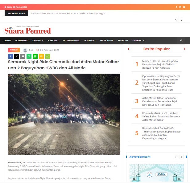Semarak Night Ride Cinematic dari Astra Motor Kalbar untuk Paguyuban HWBC dan All Matic by masmul 26 Februari 2026 in Silahkan kunjungi https://www.suarapemredkalbar.com/read/potret/26022026/semarak-night-ride-cinematic-dari-astra-motor-kalbar-untuk-paguyuban-hwbc-dan-all-matic. You Might Like Regional Public Launching New ADV160 The SUV Pride Grand Launching New PCX 160 Truly Exceptional! Tetap hati-hati ya bro sist berkendara saat hujan.