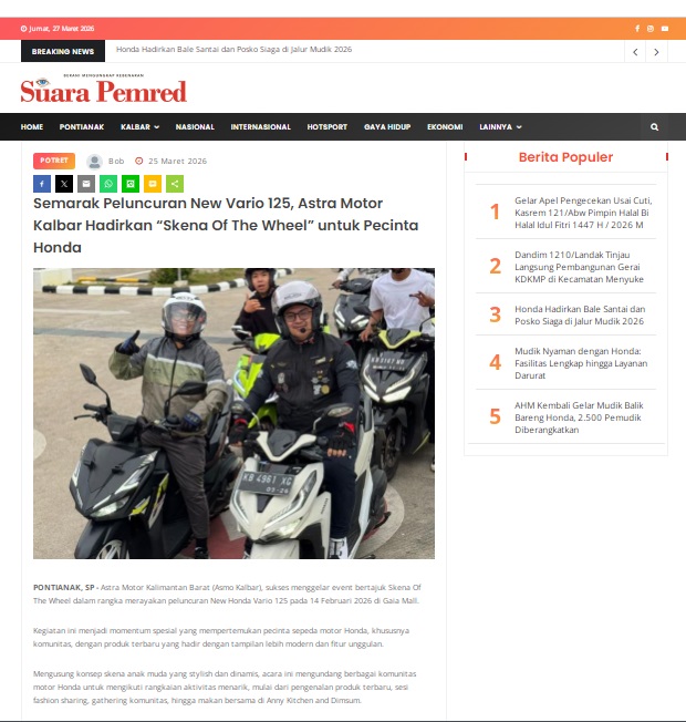 Semarak Peluncuran New Vario 125, Astra Motor Kalbar Hadirkan “Skena Of The Wheel” untuk Pecinta Honda by masmul 25 Maret 2026 in Silahkan kunjungi https://www.suarapemredkalbar.com/read/potret/25032026/semarak-peluncuran-new-vario-125-astra-motor-kalbar-hadirkan-skena-of-the-wheel-untuk-pecinta-honda. You Might Like Regional Public Launching New ADV160 The SUV Pride Grand Launching New PCX 160 Truly Exceptional! Tetap hati-hati ya bro sist berkendara saat hujan.