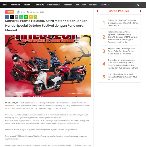 Semarak Promo Halofest, Astra Motor Kalbar Berikan Honda Special October Festival dengan Penawaran Menarik by masmul 20 Oktober 2025 in Silahkan kunjungi https://www.suarapemredkalbar.com/read/potret/20102025/semarak-promo-halofest-astra-motor-kalbar-berikan-honda-special-october-festival-dengan-penawaran-menarik. You Might Like Regional Public Launching New ADV160 The SUV Pride Grand Launching New PCX 160 Truly Exceptional! Tetap hati-hati ya bro sist berkendara saat hujan.