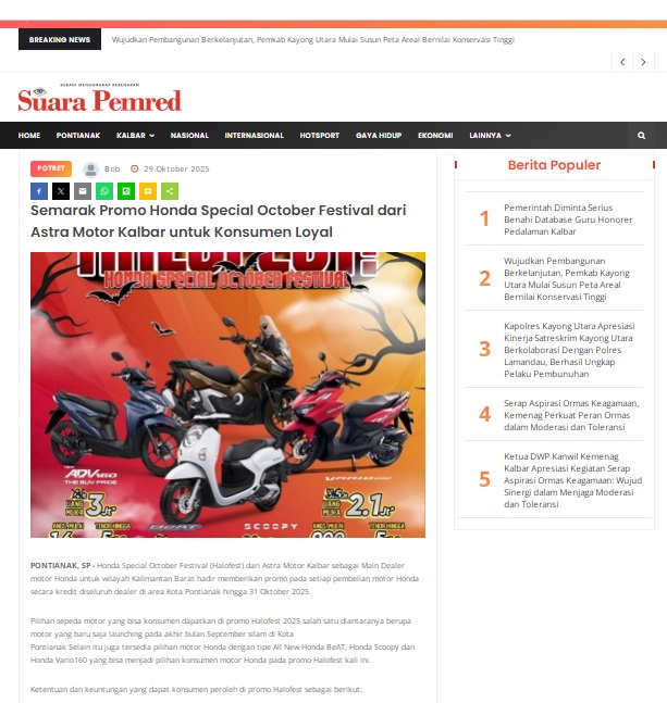Semarak Promo Honda Special October Festival dari Astra Motor Kalbar untuk Konsumen Loyal by masmul 29 Oktober 2025 in Silahkan kunjungi https://www.suarapemredkalbar.com/read/potret/29102025/semarak-promo-honda-special-october-festival-dari-astra-motor-kalbar-untuk-konsumen-loyal. You Might Like Regional Public Launching New ADV160 The SUV Pride Grand Launching New PCX 160 Truly Exceptional! Tetap hati-hati ya bro sist berkendara saat hujan.
