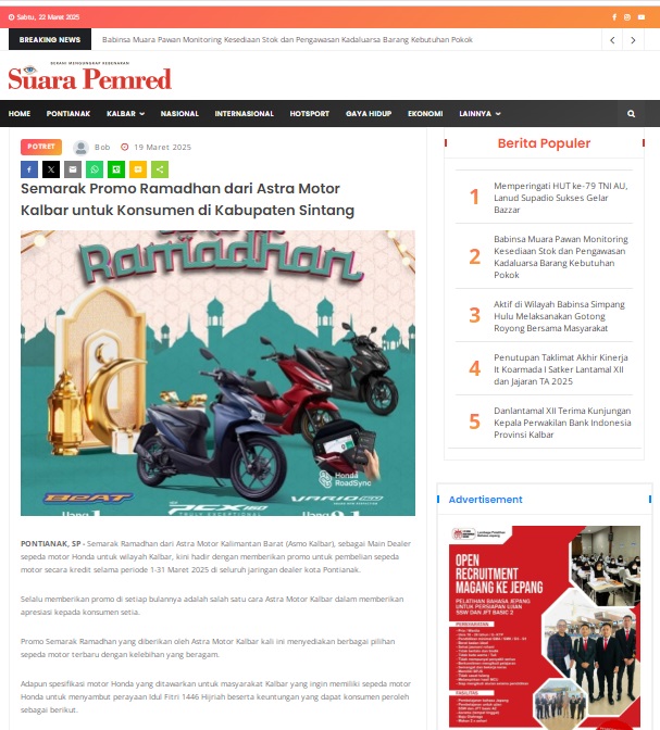 Semarak Promo Ramadhan dari Astra Motor Kalbar untuk Konsumen di Kabupaten Sintang by masmul 19 Maret 2025 in Silahkan kunjungi https://www.suarapemredkalbar.com/read/potret/19032025/semarak-promo-ramadhan-dari-astra-motor-kalbaruntuk-konsumen-di-kabupaten-sintang. You Might Like Regional Public Launching New ADV160 The SUV Pride Grand Launching New PCX 160 Truly Exceptional! Tetap hati-hati ya bro sist berkendara saat hujan.