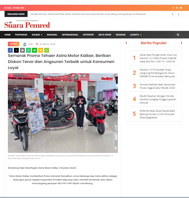 Semarak Promo Tehaer Astra Motor Kalbar, Berikan Diskon Tenor dan Angsuran Terbaik untuk Konsumen Loyal by masmul 26 Maret 2026 in Silahkan kunjungi https://www.suarapemredkalbar.com/read/potret/26032026/semarak-promo-tehaer-astra-motor-kalbar-berikan-diskon-tenor-dan-angsuran-terbaik-untuk-konsumen-loyal. You Might Like Regional Public Launching New ADV160 The SUV Pride Grand Launching New PCX 160 Truly Exceptional! Tetap hati-hati ya bro sist berkendara saat hujan.