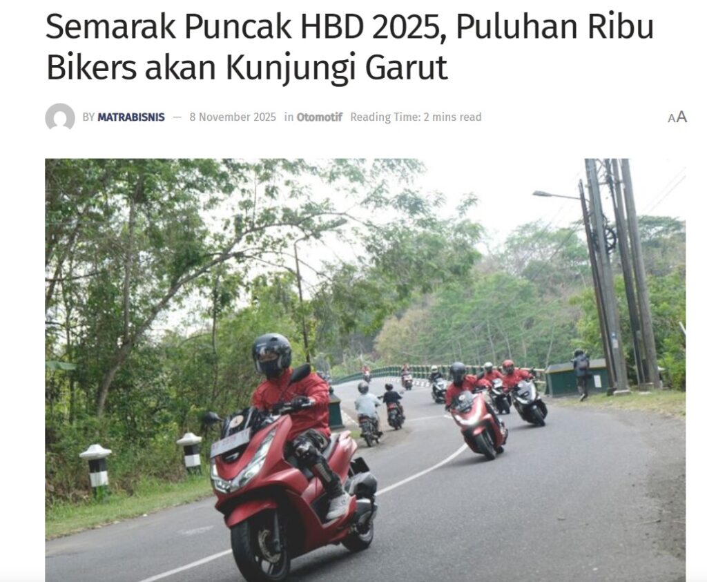 Semarak Puncak HBD 2025, Puluhan Ribu Bikers akan Kunjungi Garut by Sri Yuliantiningsih 8 November 2025 in Silahkan kunjungi https://matrabisnis.id/2025/11/08/semarak-puncak-hbd-2025-puluhan-ribu-bikers-akan-kunjungi-garut/. You Might Like Regional Public Launching New ADV160 The SUV Pride Grand Launching New PCX 160 Truly Exceptional! Tetap hati-hati ya bro sist berkendara saat hujan.
