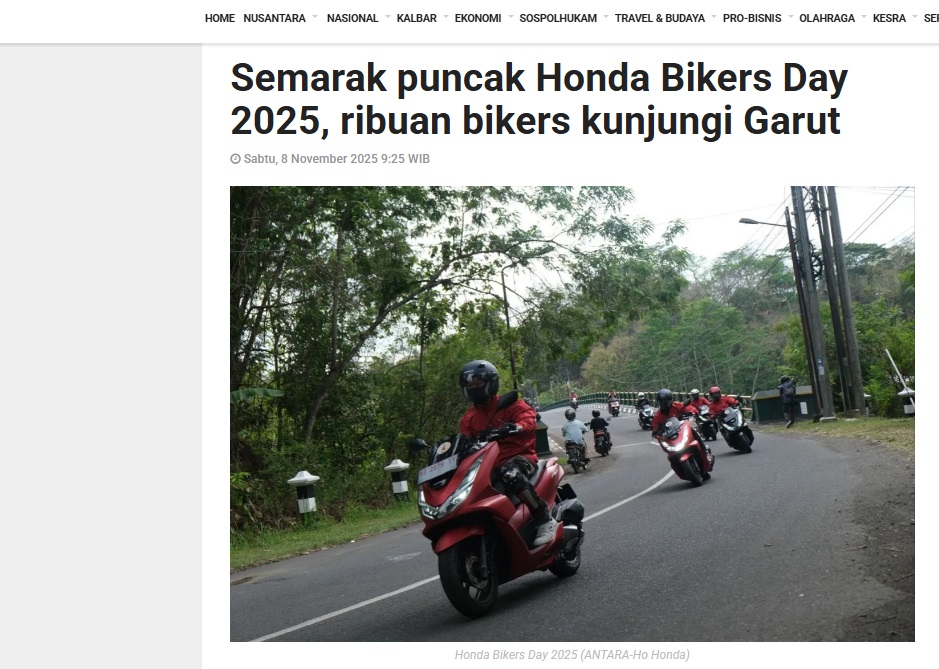 Semarak puncak Honda Bikers Day 2025, ribuan bikers kunjungi Garut by Dedi 8 November 2025 in Silahkan kunjungi https://kalbar.antaranews.com/berita/672797/semarak-puncak-honda-bikers-day-2025-ribuan-bikers-kunjungi-garut. You Might Like Regional Public Launching New ADV160 The SUV Pride Grand Launching New PCX 160 Truly Exceptional! Tetap hati-hati ya bro sist berkendara saat hujan.