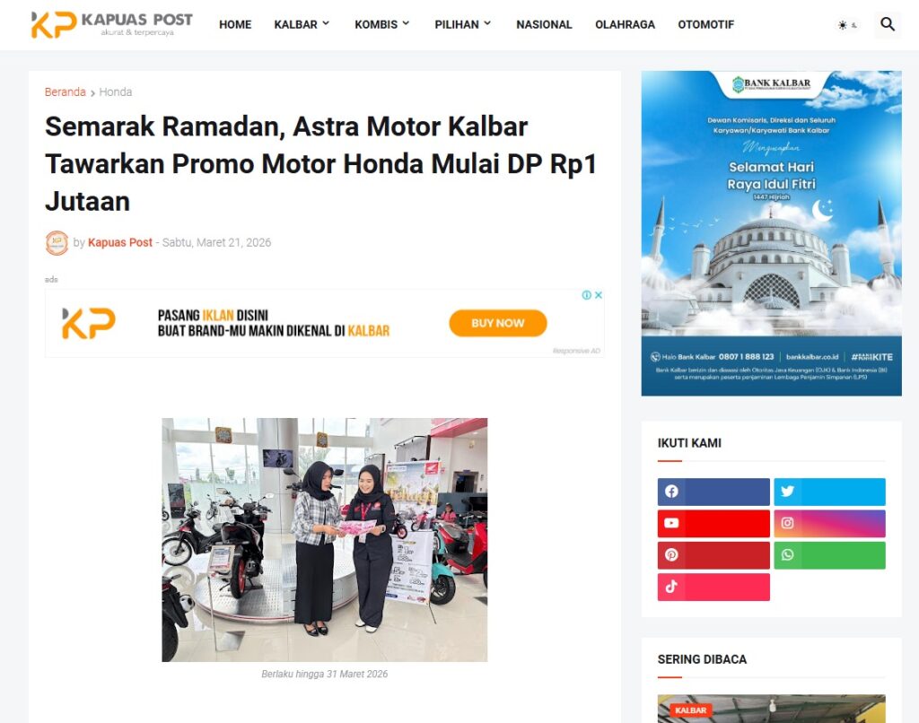 Semarak Ramadan, Astra Motor Kalbar Tawarkan Promo Motor Honda Mulai DP Rp1 Jutaan by Muhammad Arif 21 Maret 2026 in Silahkan kunjungi https://www.kapuaspost.web.id/2026/03/semarak-ramadan-astra-motor-kalbar.html. Tags: astra Astra Motor kalbar Astra Motor Pontianak astramotor honda kalbar pontianak sepeda motor You Might Like Regional Public Launching New ADV160 The SUV Pride Grand Launching New PCX 160 Truly Exceptional! Tetap hati-hati ya bro sist berkendara saat hujan.