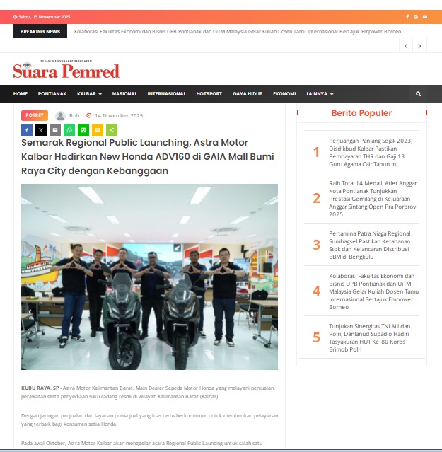 Semarak Regional Public Launching, Astra Motor Kalbar Hadirkan New Honda ADV160 di GAIA Mall Bumi Raya City dengan Kebanggaan by masmul 14 November 2025 in Silahkan kunjungi https://www.suarapemredkalbar.com/read/potret/14112025/semarak-regional-public-launching-astra-motor-kalbar-hadirkan-new-honda-adv160-di-gaia-mall-bumi-raya-city-dengan-kebanggaan. You Might Like Regional Public Launching New ADV160 The SUV Pride Grand Launching New PCX 160 Truly Exceptional! Tetap hati-hati ya bro sist berkendara saat hujan.