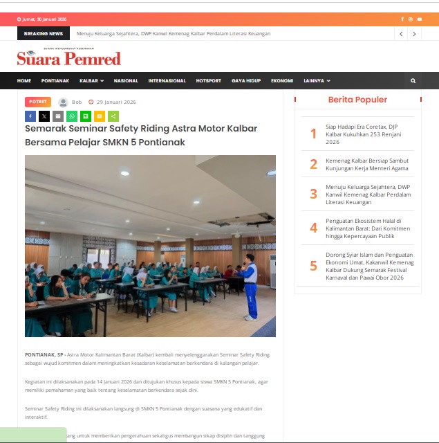 Semarak Seminar Safety Riding Astra Motor Kalbar Bersama Pelajar SMKN 5 Pontianak by masmul 29 Januari 2026 in Silahkan kunjungi https://www.suarapemredkalbar.com/read/potret/29012026/semarak-seminar-safety-riding-astra-motor-kalbar-bersama-pelajar-smkn-5-pontianak. You Might Like Regional Public Launching New ADV160 The SUV Pride Grand Launching New PCX 160 Truly Exceptional! Tetap hati-hati ya bro sist berkendara saat hujan.