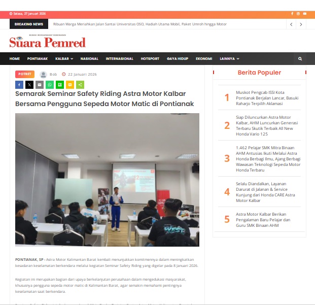 Semarak Seminar Safety Riding Astra Motor Kalbar Bersama Pengguna Sepeda Motor Matic di Pontianak by masmul 22 Januari 2026 in Silahkan kunjungi https://www.suarapemredkalbar.com/read/potret/22012026/semarak-seminar-safety-riding-astra-motor-kalbar-bersama-pengguna-sepeda-motor-matic-di-pontianak. You Might Like Regional Public Launching New ADV160 The SUV Pride Grand Launching New PCX 160 Truly Exceptional! Tetap hati-hati ya bro sist berkendara saat hujan.
