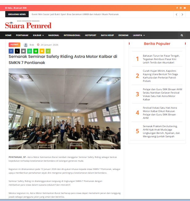 Semarak Seminar Safety Riding Astra Motor Kalbar di SMKN 7 Pontianak by masmul 24 Januari 2026 in Silahkan kunjungi https://www.suarapemredkalbar.com/read/potret/24012026/semarak-seminar-safety-riding-astra-motor-kalbar-di-smkn-7-pontianak. You Might Like Regional Public Launching New ADV160 The SUV Pride Grand Launching New PCX 160 Truly Exceptional! Tetap hati-hati ya bro sist berkendara saat hujan.