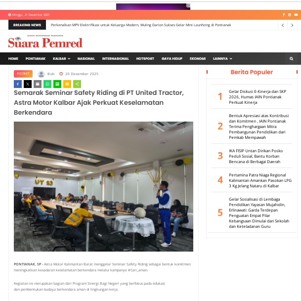 Semarak Seminar Safety Riding di PT United Tractor, Astra Motor Kalbar Ajak Perkuat Keselamatan Berkendara by masmul 20 Desember 2025 in Silahkan kunjungi https://www.suarapemredkalbar.com/read/potret/20122025/semarak-seminar-safety-riding-di-pt-united-tractor-astra-motor-kalbar-ajak-perkuat-keselamatan-berkendara. You Might Like Regional Public Launching New ADV160 The SUV Pride Grand Launching New PCX 160 Truly Exceptional! Tetap hati-hati ya bro sist berkendara saat hujan.