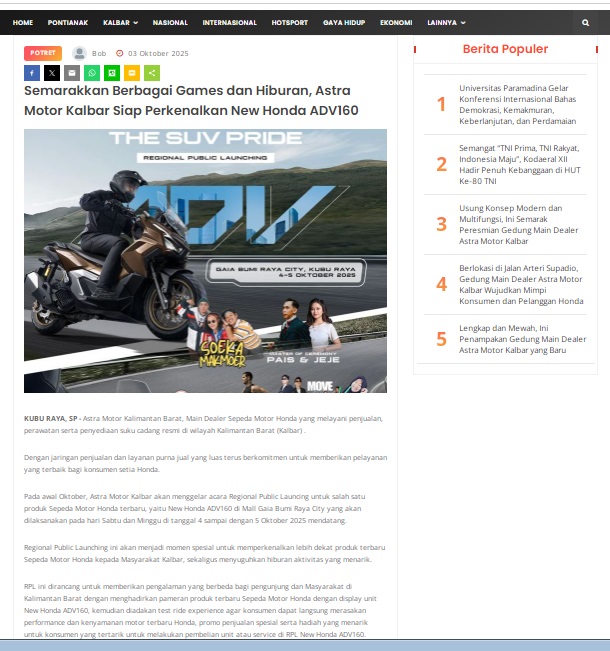 Semarakkan Berbagai Games dan Hiburan, Astra Motor Kalbar Siap Perkenalkan New Honda ADV160 by masmul 3 Oktober 2025 in Silahkan kunjungi https://www.suarapemredkalbar.com/read/potret/03102025/semarakkan-berbagai-games-dan-hiburan-astra-motor-kalbar-siap-perkenalkan-new-honda-adv160. You Might Like Regional Public Launching New ADV160 The SUV Pride Grand Launching New PCX 160 Truly Exceptional! Tetap hati-hati ya bro sist berkendara saat hujan.