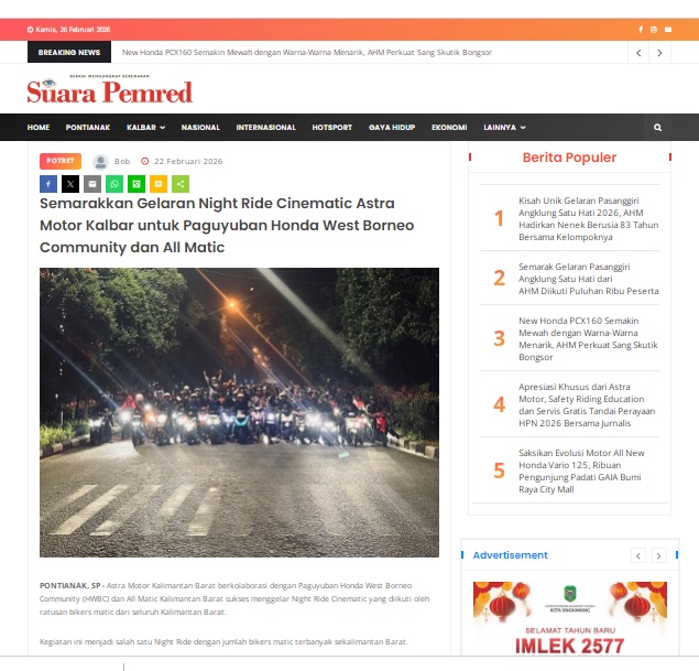 Semarakkan Gelaran Night Ride Cinematic Astra Motor Kalbar untuk Paguyuban Honda West Borneo Community dan All Matic by masmul 22 Februari 2026 in Silahkan kunjungi https://www.suarapemredkalbar.com/read/potret/22022026/semarakkan-gelaran-night-ride-cinematic-astra-motor-kalbar-untuk-paguyuban-honda-west-borneo-community-dan-all-matic. You Might Like Regional Public Launching New ADV160 The SUV Pride Grand Launching New PCX 160 Truly Exceptional! Tetap hati-hati ya bro sist berkendara saat hujan.