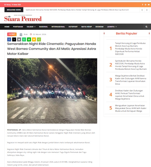 Semarakkan Night Ride Cinematic: Paguyuban Honda West Borneo Community dan All Matic Apresiasi Astra Motor Kalbar by masmul 2 Maret 2026 in Silahkan kunjungi https://www.suarapemredkalbar.com/read/potret/02032026/semarakkan-night-ride-cinematic-paguyuban-honda-west-borneo-community-dan-all-matic-apresiasi-astra-motor-kalbar. You Might Like Regional Public Launching New ADV160 The SUV Pride Grand Launching New PCX 160 Truly Exceptional! Tetap hati-hati ya bro sist berkendara saat hujan.