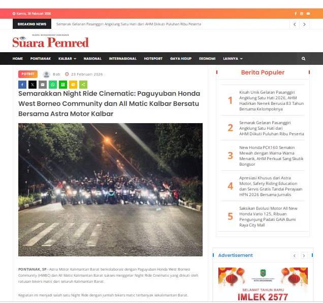 Semarakkan Night Ride Cinematic: Paguyuban Honda West Borneo Community dan All Matic Kalbar Bersatu Bersama Astra Motor Kalbar by masmul 23 Februari 2026 in Silahkan kunjungi https://www.suarapemredkalbar.com/read/potret/23022026/semarakkan-night-ride-cinematic-paguyuban-honda-west-borneo-community-dan-all-matic-kalbar-bersatu-bersama-astra-motor-kalbar. You Might Like Regional Public Launching New ADV160 The SUV Pride Grand Launching New PCX 160 Truly Exceptional! Tetap hati-hati ya bro sist berkendara saat hujan.