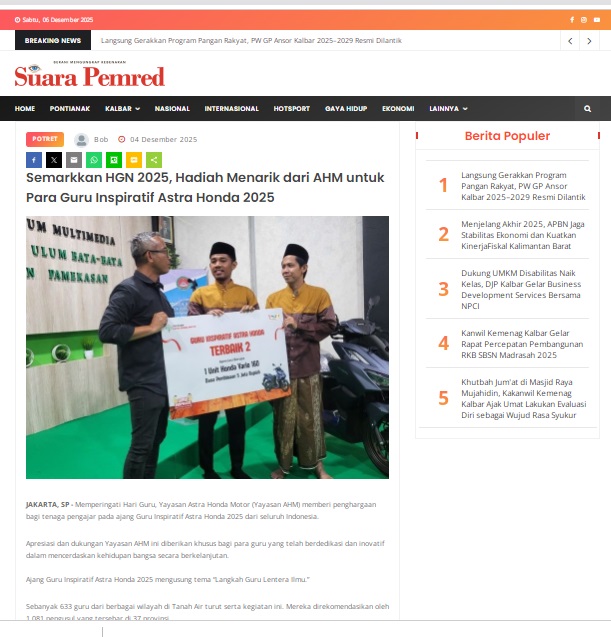 Semarkkan HGN 2025, Hadiah Menarik dari AHM untuk Para Guru Inspiratif Astra Honda 2025 by masmul 4 Desember 2025 in Silahkan kunjungi https://www.suarapemredkalbar.com/read/potret/04122025/semarkkan-hgn-2025-hadiah-menarik-dari-ahm-untuk-para-guru-inspiratif-astra-honda-2025. You Might Like Regional Public Launching New ADV160 The SUV Pride Grand Launching New PCX 160 Truly Exceptional! Tetap hati-hati ya bro sist berkendara saat hujan.