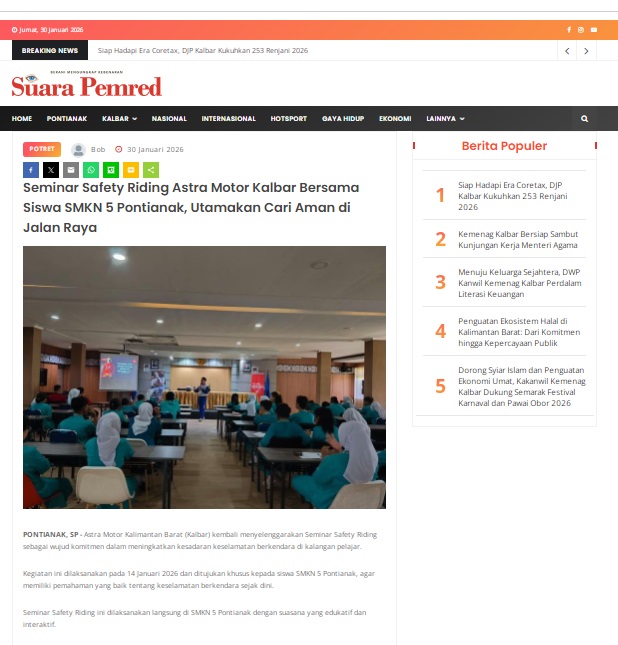 Seminar Safety Riding Astra Motor Kalbar Bersama Siswa SMKN 5 Pontianak, Utamakan Cari Aman di Jalan Raya by masmul 30 Januari 2026 in Silahkan kunjungi https://www.suarapemredkalbar.com/read/potret/30012026/seminar-safety-riding-astra-motor-kalbar-bersama-siswa-smkn-5-pontianak-utamakan-cari-aman-di-jalan-raya. You Might Like Regional Public Launching New ADV160 The SUV Pride Grand Launching New PCX 160 Truly Exceptional! Tetap hati-hati ya bro sist berkendara saat hujan.