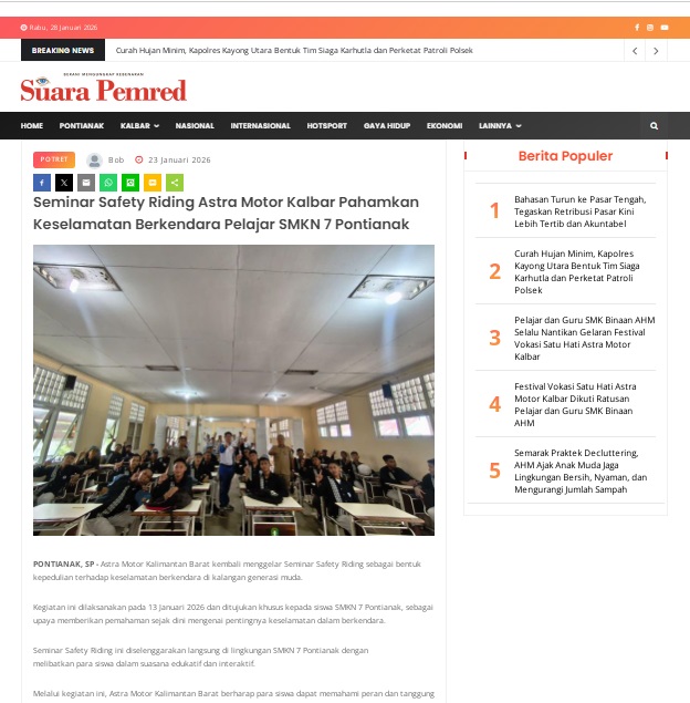 Seminar Safety Riding Astra Motor Kalbar Pahamkan Keselamatan Berkendara Pelajar SMKN 7 Pontianak by masmul 23 Januari 2026 in Silahkan kunjungi https://www.suarapemredkalbar.com/read/potret/23012026/seminar-safety-riding-astra-motor-kalbar-pahamkan-keselamatan-berkendara-pelajar-smkn-7-pontianak. You Might Like Regional Public Launching New ADV160 The SUV Pride Grand Launching New PCX 160 Truly Exceptional! Tetap hati-hati ya bro sist berkendara saat hujan.