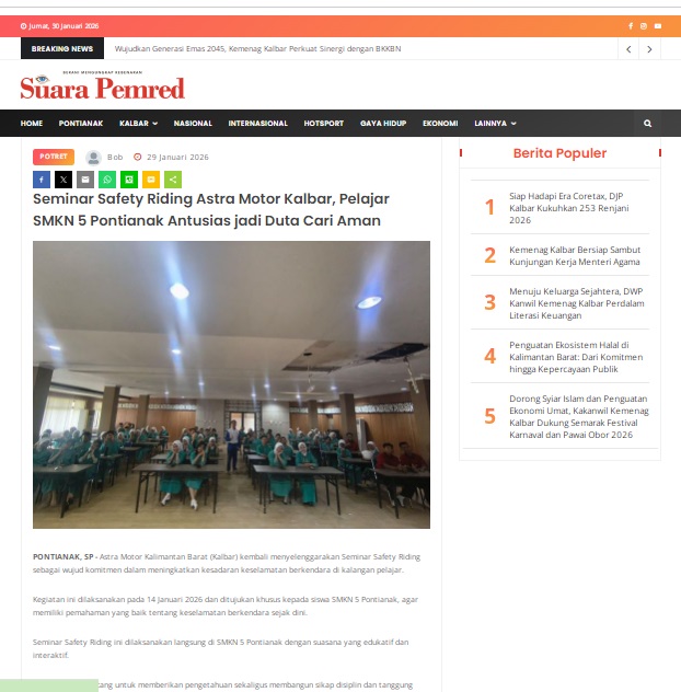 Seminar Safety Riding Astra Motor Kalbar, Pelajar SMKN 5 Pontianak Antusias jadi Duta Cari Aman by masmul 29 Januari 2026 in Silahkan kunjungi https://www.suarapemredkalbar.com/read/potret/29012026/seminar-safety-riding-astra-motor-kalbar-pelajar-smkn-5-pontianak-antusias-jadi-duta-cari-aman. You Might Like Regional Public Launching New ADV160 The SUV Pride Grand Launching New PCX 160 Truly Exceptional! Tetap hati-hati ya bro sist berkendara saat hujan.
