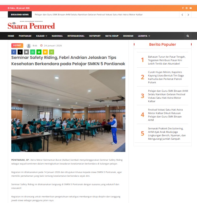 Seminar Safety Riding, Febri Andrian Jelaskan Tips Kesehatan Berkendara pada Pelajar SMKN 5 Pontianak by masmul 24 Januari 2026 in Silahkan kunjungi https://www.suarapemredkalbar.com/read/potret/24012026/seminar-safety-riding-febri-andrian-jelaskan-tips-kesehatan-berkendara-pada-pelajar-smkn-5-pontianak. You Might Like Regional Public Launching New ADV160 The SUV Pride Grand Launching New PCX 160 Truly Exceptional! Tetap hati-hati ya bro sist berkendara saat hujan.
