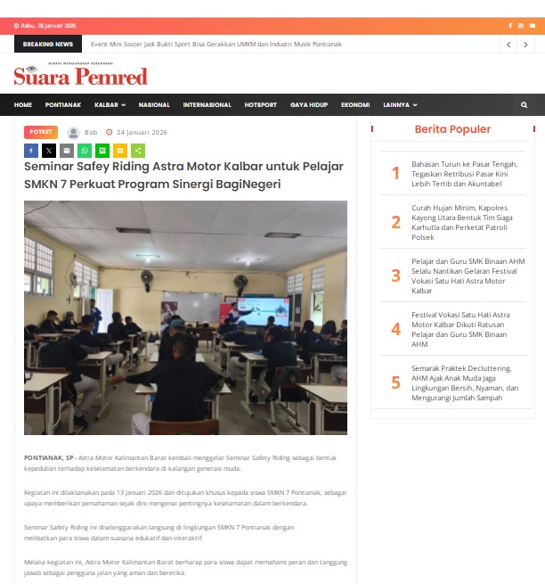 Seminar Safey Riding Astra Motor Kalbar untuk Pelajar SMKN 7 Perkuat Program Sinergi Bagi Negeri by masmul 24 Januari 2026 in Silahkan kunjungi https://www.suarapemredkalbar.com/read/potret/24012026/seminar-safey-riding-astra-motor-kalbar-untuk-pelajar-smkn-7-perkuat-program-sinergi-baginegeri. You Might Like Regional Public Launching New ADV160 The SUV Pride Grand Launching New PCX 160 Truly Exceptional! Tetap hati-hati ya bro sist berkendara saat hujan.