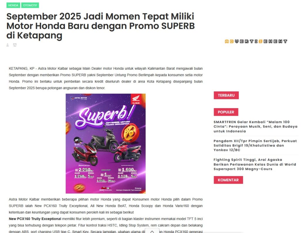 September 2025 Jadi Momen Tepat Miliki Motor Honda Baru dengan Promo SUPERB di Ketapang by Muhammad Arif 11 September 2025 in Silahkan kunjungi https://www.kapuaspost.web.id/2025/09/september-2025-jadi-momen-tepat-miliki.html. Tags: astra Astra Motor kalbar Astra Motor Pontianak astramotor honda kalbar pontianak sepeda motor You Might Like Regional Public Launching New ADV160 The SUV Pride Grand Launching New PCX 160 Truly Exceptional! Tetap hati-hati ya bro sist berkendara saat hujan.