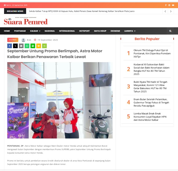 September Untung Promo Berlimpah, Astra Motor Kalbar Berikan Penawaran Terbaik Lewat by masmul 19 September 2025 in Silahkan kunjungi https://www.suarapemredkalbar.com/read/potret/19092025/september-untung-promo-berlimpah-astra-motor-kalbar-berikan-penawaran-terbaik-lewat. You Might Like Regional Public Launching New ADV160 The SUV Pride Grand Launching New PCX 160 Truly Exceptional! Tetap hati-hati ya bro sist berkendara saat hujan.