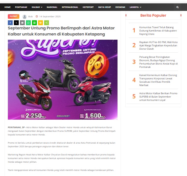 September Untung Promo Berlimpah dari Astra Motor Kalbar untuk Konsumen di Kabupaten Ketapang by masmul 14 September 2025 in Silahkan kunjungi https://www.suarapemredkalbar.com/read/potret/14092025/september-untung-promo-berlimpah-dari-astra-motor-kalbar-untuk-konsumen-di-kabupaten-ketapang. You Might Like Regional Public Launching New ADV160 The SUV Pride Grand Launching New PCX 160 Truly Exceptional! Tetap hati-hati ya bro sist berkendara saat hujan.