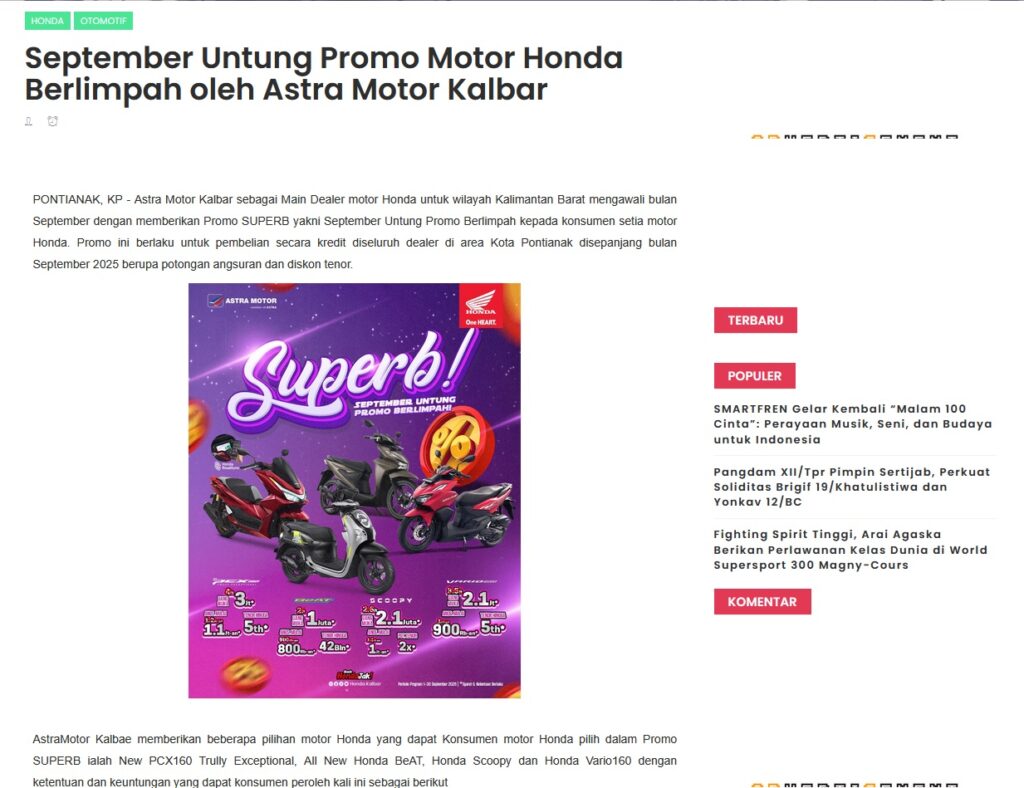 September Untung Promo Motor Honda Berlimpah oleh Astra Motor Kalbar by Muhammad Arif 10 September 2025 in Silahkan kunjungi https://www.kapuaspost.web.id/2025/09/september-untung-promo-motor-honda.html. Tags: astra Astra Motor kalbar Astra Motor Pontianak astramotor honda kalbar pontianak sepeda motor You Might Like Regional Public Launching New ADV160 The SUV Pride Grand Launching New PCX 160 Truly Exceptional! Tetap hati-hati ya bro sist berkendara saat hujan.