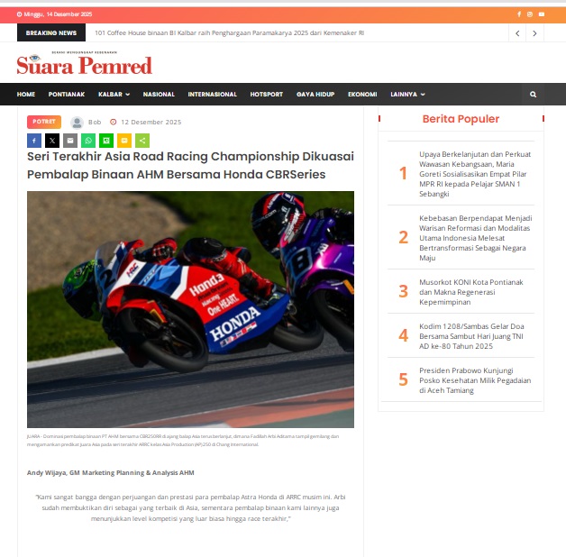 Seri Terakhir Asia Road Racing Championship Dikuasai Pembalap Binaan AHM Bersama Honda CBRSeries by masmul 12 Desember 2025 in Silahkan kunjungi https://www.suarapemredkalbar.com/read/potret/12122025/seri-terakhir-asia-road-racing-championship-dikuasai-pembalap-binaan-ahm-bersama-honda-cbrseries. You Might Like Regional Public Launching New ADV160 The SUV Pride Grand Launching New PCX 160 Truly Exceptional! Tetap hati-hati ya bro sist berkendara saat hujan.