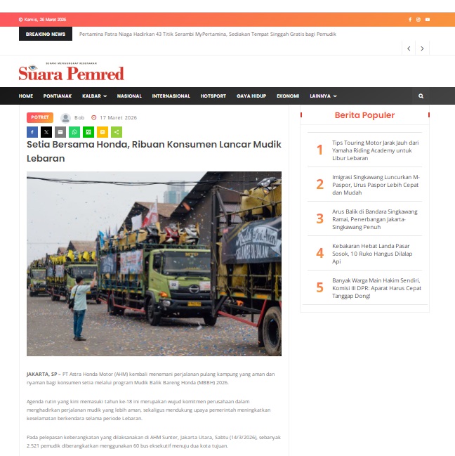 Setia Bersama Honda, Ribuan Konsumen Lancar Mudik Lebaran by masmul 17 Maret 2026 in Silahkan kunjungi https://www.suarapemredkalbar.com/read/potret/17032026/setia-bersama-honda-ribuan-konsumen-lancar-mudik-lebaran. You Might Like Regional Public Launching New ADV160 The SUV Pride Grand Launching New PCX 160 Truly Exceptional! Tetap hati-hati ya bro sist berkendara saat hujan.