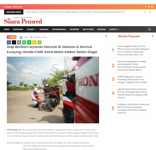 Siap Berikan Layanan Darurat di Jalanan & Service Kunjung, Honda CARE Astra Motor Kalbar Selalu Siaga by masmul 29 Maret 2026 in Silahkan kunjungi https://www.suarapemredkalbar.com/read/potret/29032026/siap-berikan-layanan-darurat-di-jalanan-service-kunjung-honda-care-astra-motor-kalbarselalu-siaga. You Might Like Regional Public Launching New ADV160 The SUV Pride Grand Launching New PCX 160 Truly Exceptional! Tetap hati-hati ya bro sist berkendara saat hujan.